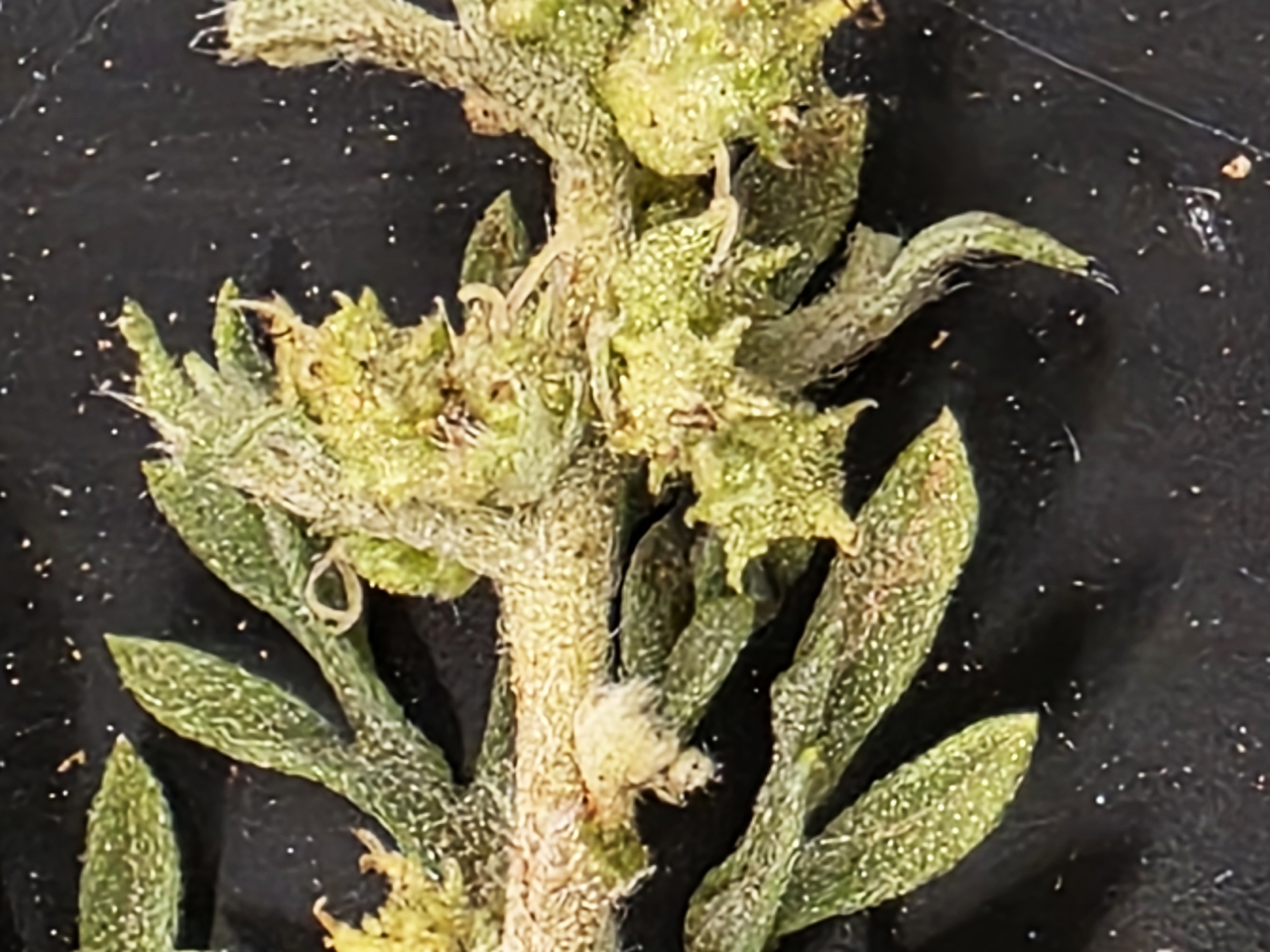 Ambrosia confertiflora, macro of carpellate flowers, photo Russ Kleinman and the Silver City Flora Group (Bill Norris, Wendy Graves, Jim & Jane Spinti, Angela Flanders, Betsy Kaido, & Jon Titus), Silver City, WNMU campus, 10th and West, September 4, 2025