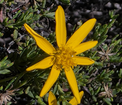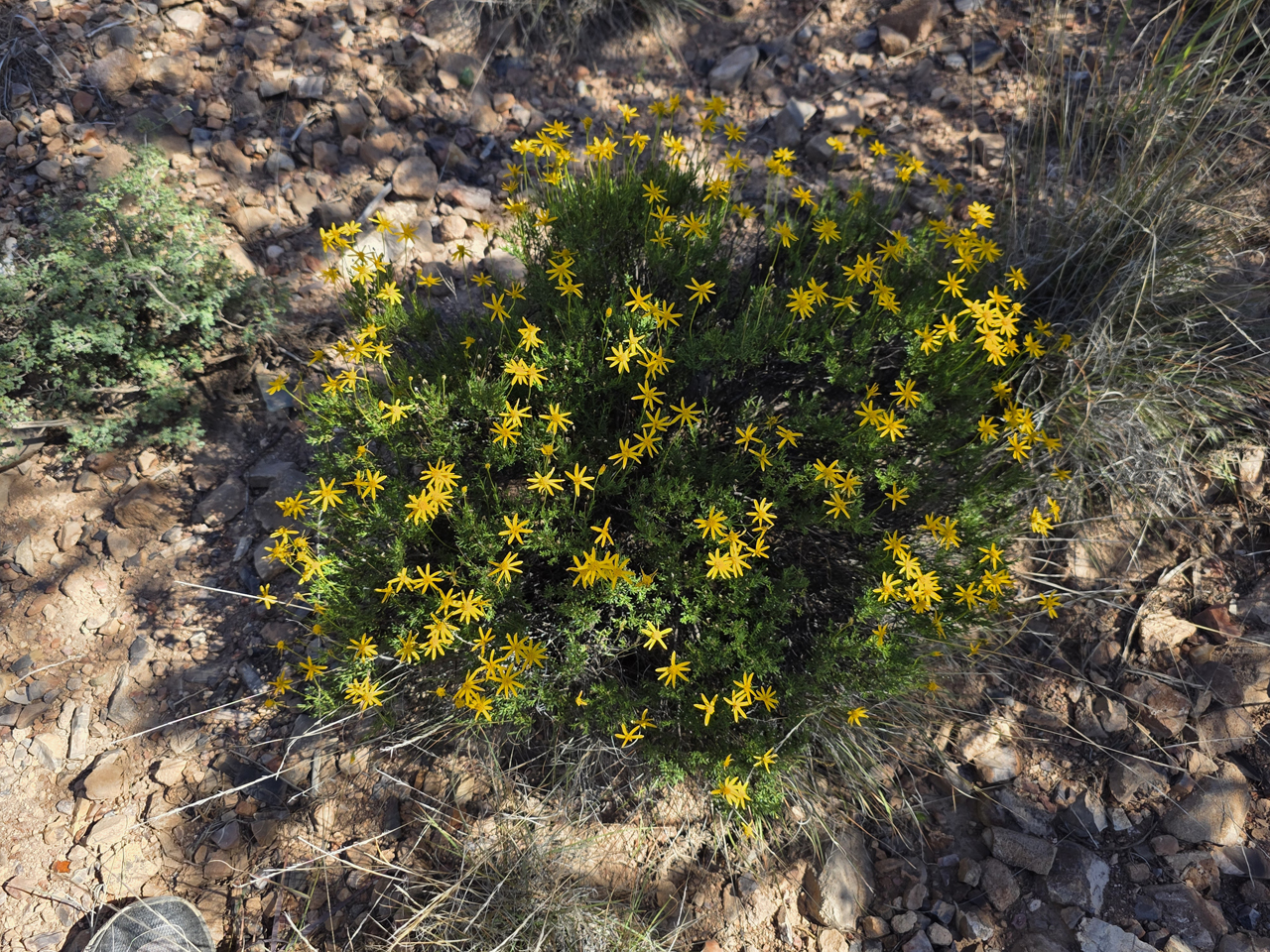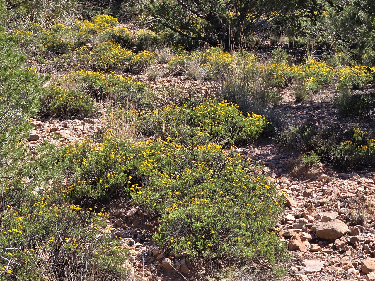 Chrysactinia mexicana is a small shrub from a woody base. The leaves are small, sessile-glandular and nearly terete. The flowerheads are long pedunculate with 7-8 yellow ray flowers and around 20 yellow disc flowers. The pappus is of many bristles. Chrysactinia mexicana is found on rocky hillsides especially near limestone. Many thanks to Wendy Graves for showing us this location just outside the Silver City limits-- Dr. Dale A. Zimmerman collected this species from exactly this location nearly 50 years ago, so the population is doing well!