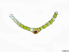 This moss is found in small clumps in the mud flats along the Gila River. The globose terminal paraphyseal cells and the large, clear laminal cells identify it as part of the Funariaceae. In the Funariaceae, identification even to the genus level requires sporophytes. The sporophyte of Funaria hygrometrica var. hygrometrica is pyriform, with a bright red annulus and mouth that is oblique to the axis of the capsule. The annulus pops off in a ring when the operculum falls, and is called a "revoluble" annulus. Usually the annulus breaks into several segments that spirally coil after separation from the operculum and urn. The pattern of cells on the operculum is spiral. Since the peristome develops from the operculum, that spiral pattern is repeated in the orientation of the peristome teeth. The peristome of Funaria is termed a "double peristome" because it occurs in an inner (endostome) and outer (exostome) ring. In Funaria, both inner and outer peristome segments appear as teeth, with the inner peristome teeth being a bit shorter. The inner peristome teeth are also a pale yellow in contrast to the deep orange of the exostome teeth. In other mosses, the endostome may be lacking or look like cilia.
