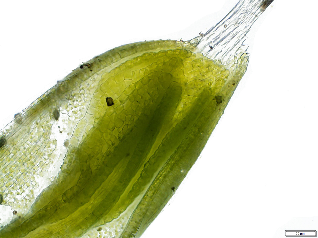 tissue that arise anteriorly from the costa. These plates form a darker medial zone to the leaves tapering to the base when seen at low power. There are no obvious papillae.