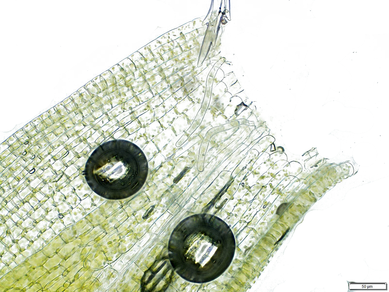 Pterygoneurum ovatum, photomicrograph of leaf, photo Russ Kleinman, Kelly Allred & Karen Blisard, Cibola Cty., El Malpais National Monument,