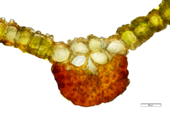 Syntrichia pagorum prefers to grow on either live or downed wood at lower elevation in the Gila. It has oblanceolate, papillose leaves with plane margins. The apex is truncate to emarginate with a smooth hairpoint that is up to 1/2 the length of the lamina. The costa is smooth (without papillae) on the abaxial surface. The most impressive character, though, is the mass of brood leaves found in the axils of the comal leaves. The brood leaves are fusiform, green, papillose, without a costa, and apiculate. There are hydroids in the costa, visible as an irregularly triangular space beneath the guide cells. The stem has an obvious central strand.
